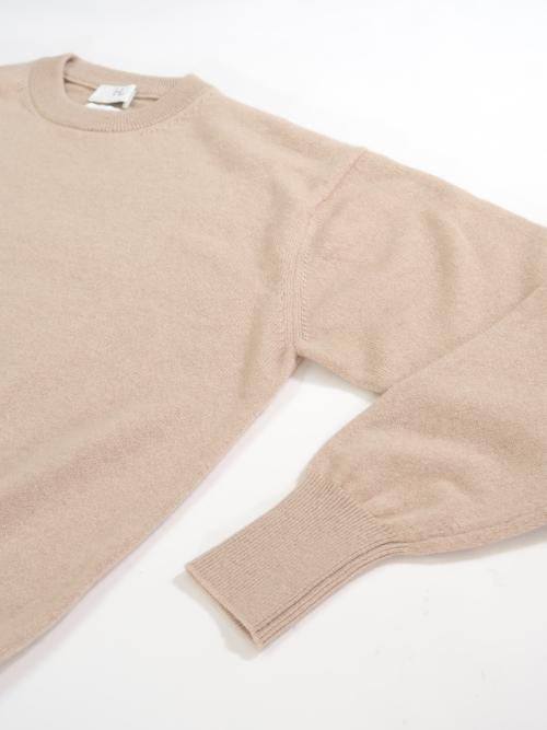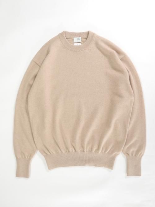 少し前下がりがあり自然に首に沿うクルーネック、袖と裾はリブ編みで仕上げています。
